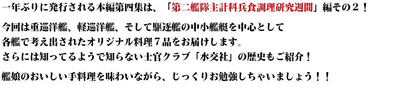 新展開・昭和10年に行われたお料理研究会「第二艦隊主計科兵食調理研究週間」編がスタート! 戦後初の出版化となる今回から、ついに重巡娘や第六駆逐隊のお料理レシピが登場します。 歴史に埋もれた艦娘たちのお料理を、心ゆくまで堪能しよう!