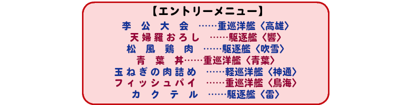 昭和14年に行われたお料理コンテスト「第一艦隊献立調理特別努力週間」編、その2が発進! 今回は霧島、長門、間宮といった人気のあの艦が登場します。 そして阿武隈ちゃんのリベンジは、果たして成功するのか!? その結末を目撃せよ!!