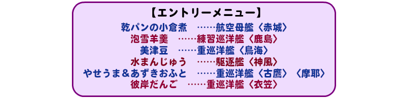 昭和14年に行われたお料理コンテスト「第一艦隊献立調理特別努力週間」編、その2が発進! 今回は霧島、長門、間宮といった人気のあの艦が登場します。 そして阿武隈ちゃんのリベンジは、果たして成功するのか!? その結末を目撃せよ!!